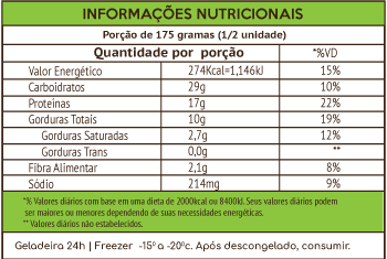 Molho branco (leite sem lactose, amido de milho, cebola em pó e noz moscada), filé de peito de frango ao molho vermelho (tomate, ervas finas, cebola em pó, pimenta branca em pó, cominho em pó), queijo sem lactose, farinha de arroz integral, ovos, fécula de batata, água, farinha de linhaça, óleo de girassol, polvilho azedo e sal rosa do himalaia.